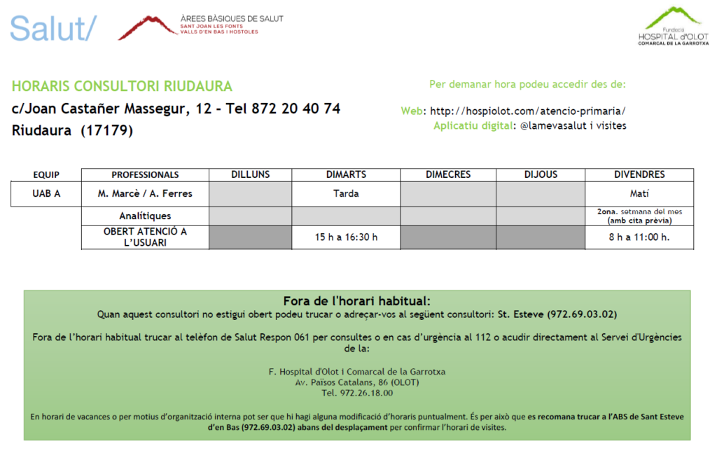 L’horari del consultori assistencial de Riudaura és: